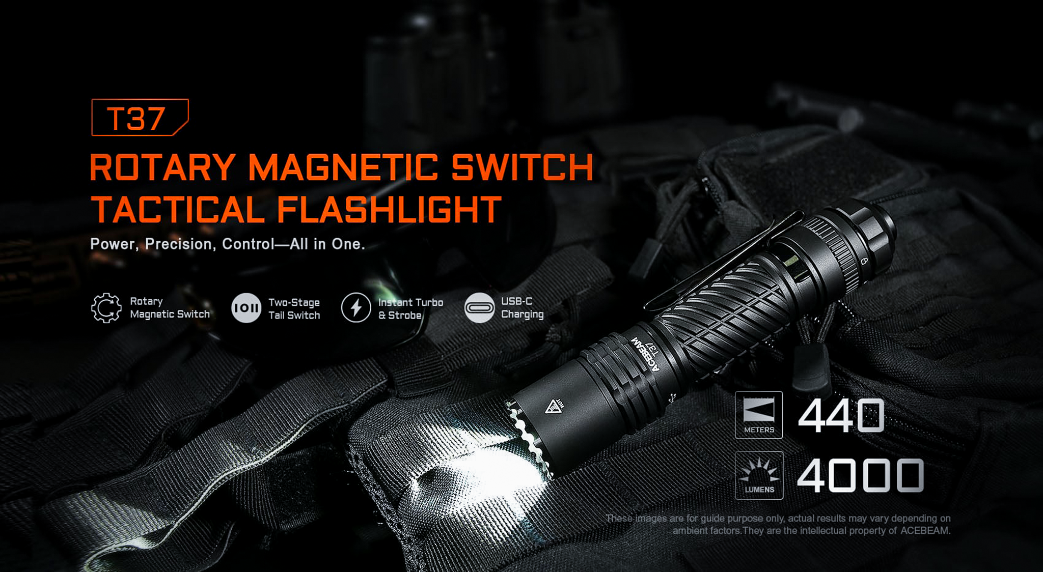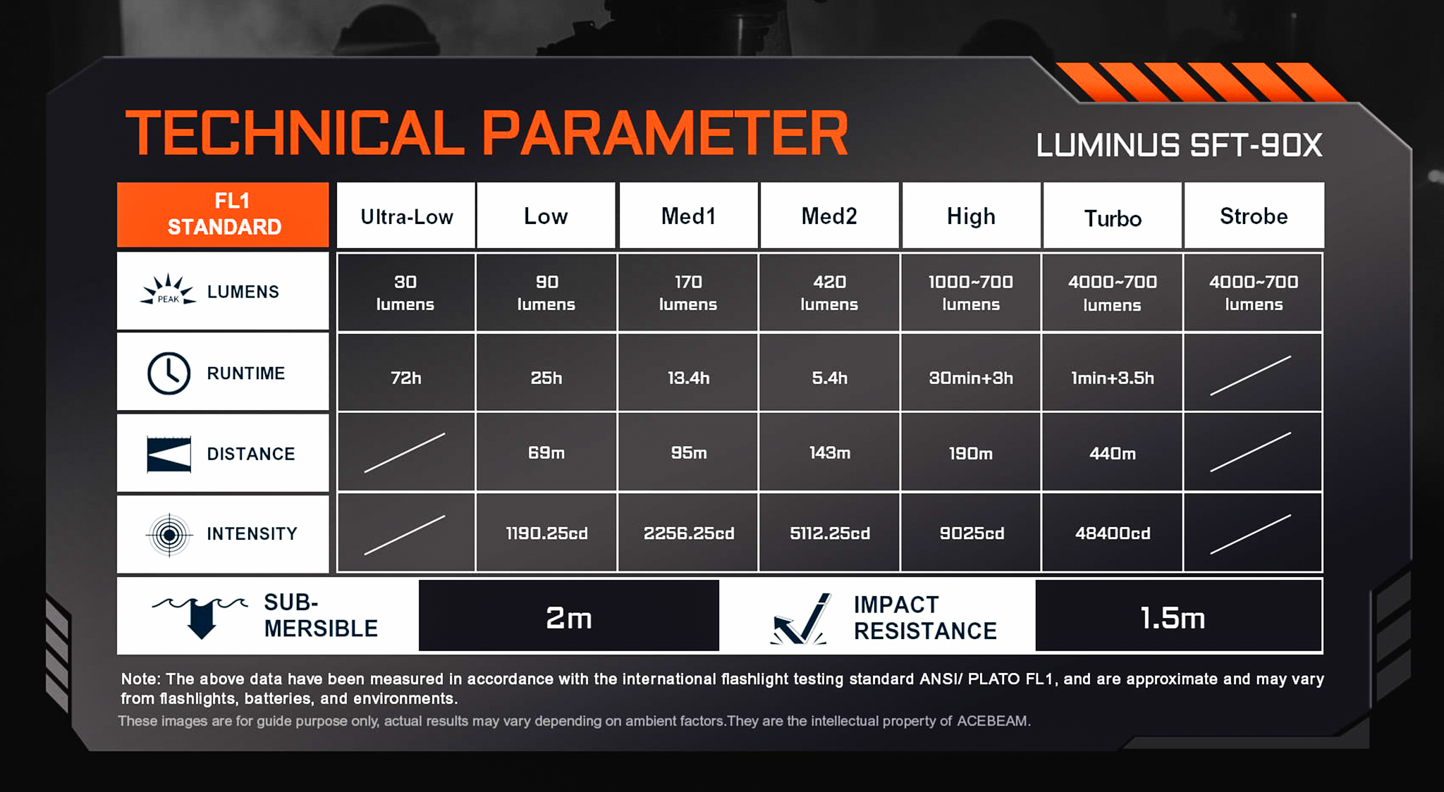 Turbo : 4,000lm 440m 30秒 & 700lm 158m 3.5時間